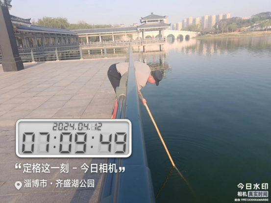 由于湖內存在很多水草,給尋找帶來了難度,值班班長和隊員輪流尋找后,因天色太晚影響視線無法進行打撈,所以結束了夜間尋找工作。4月12日清早,在仔細尋找了近3個小時后,終于在齊盛湖公園南廣場湖內打撈到了手機。隊員隨即撥打了溫女士的電話,讓其來辦公室認領??吹阶约旱氖謾C失而復得,溫女士激動不已,連連向幫助她的保安隊員道謝。