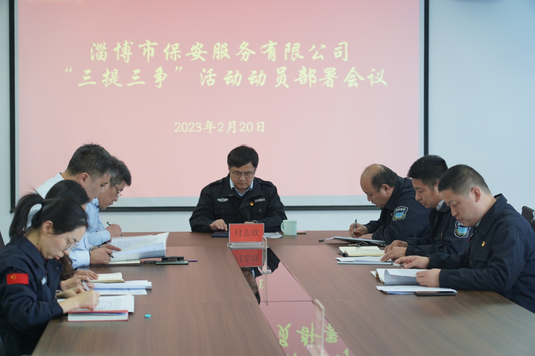 2月20日下午,淄博市保安服務有限公司召開黨委會議,學習全市“三提三爭”活動動員大會精神,傳達《市國資委黨委關于開展“三提三爭”活動的通知》要求,并對下一步工作進行研究部署。公司黨委班子全體成員參加會議,黨委書記、董事長付志欣主持會議。