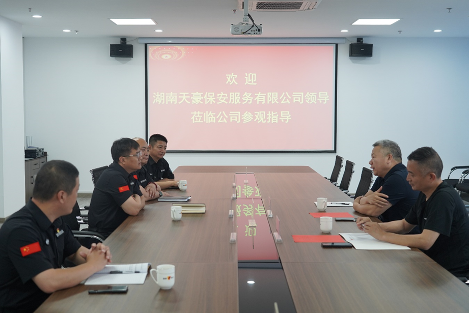 5月27日,湖南天豪保安服務有限公司董事長趙士友、總經理吳燦光蒞臨我公司交流工作,公司黨委書記、董事長付志欣,黨委委員、副總經理丁德鵬,黨委委員、副總經理王成,辦公室主任范丙磊陪同。